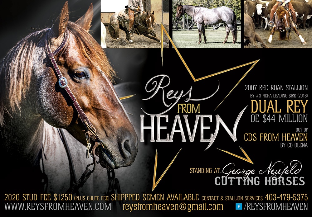 Reys From Heaven is one of the most versatile and unique bred stallions on the market right now. Of the top 10 NCHA stallions AND NRCHA Stallions, he can be crossed with 90% of those bloodlines, aside from his own sire, the great Dual Rey. This is due to his unique bottom side, CD Olena, which does not directly reflect ANY of the top ten stallions in the NCHA or NRCHA. There are VERY FEW stallions in the industry that can boast such a claim!